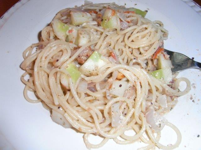 いつもいろいろ考えますが、今日のメニューはキュウリ、トマト、タマネギに梅干しとチーズを和えたソース、ピーナッツパウダーをトッピングした冷製パスタ。