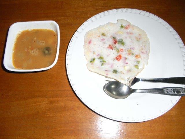 これを半日(一晩)ほど発酵させておいて、好みの野菜(プネやマハーラシュトラ州ではオニオン、トマト、グリーンチリなどが主流)と混ぜ合わせてフライパンで焼くと、パンケーキのようにふっくらとしたウタパのできあがり。 写真は真夏の暑い盛りに、夫が額に汗して作ってくれた自家製ウタパとサンバルスープです。 このときのバッター液は、マルワリ(団地併設の商店)から仕入れてきました。 ASKSiddhi 2013 Photo Gallery