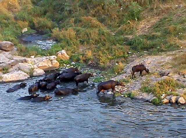 カルヤニナガルとコレガオンパークをつなぐ橋のたもと付近の河で水浴びをした後、揃って上がってくる牛さんたちです。 写真では見えませんが、前方には白い農作業衣に身を包み、白いターバンを巻いた年配の男性が、牛たちを率いていました。 なんといじらしいこと。 ASKSiddhi 2013 Photo Gallery