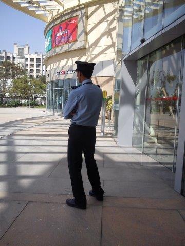 ショッピングモール前で、暇そうに突っ立っている警備員さん。