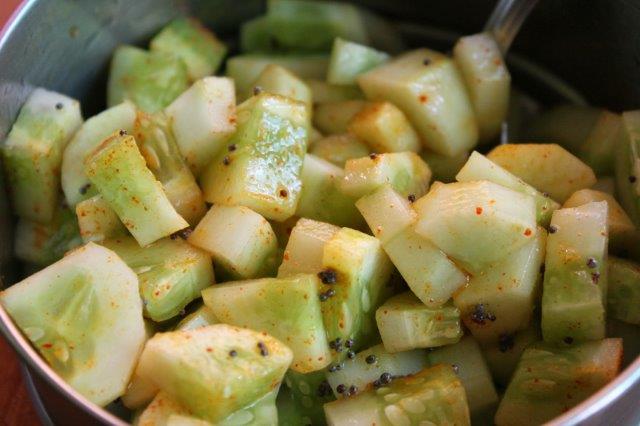 1. 2~3本のキュウリをサイコロ状に切る 2. ターメリック、チリ、塩、砂糖を少々和える 3. 油を熱し、マスタードシードを弾けさせる 4. 熱い油をキュウリにかけ、よく混ぜる 香ばしくてやみつきに! ASKSiddhi 2013 Photo Gallery