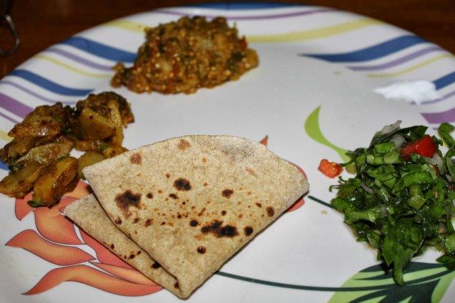 チャパティに2種類のおかず、サラダだけあれば、豪華なディナーのできあがり。