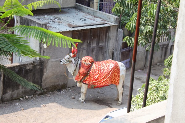 赤いローブを身にまとった牛さんです。 誰かが、この牛さんは占い師が連れて歩いていると教えてくれました。 牛さんの幸せを、占い師さんが一番に考えてあげていると、いいな。 ASKSiddhi 2013 Photo Gallery