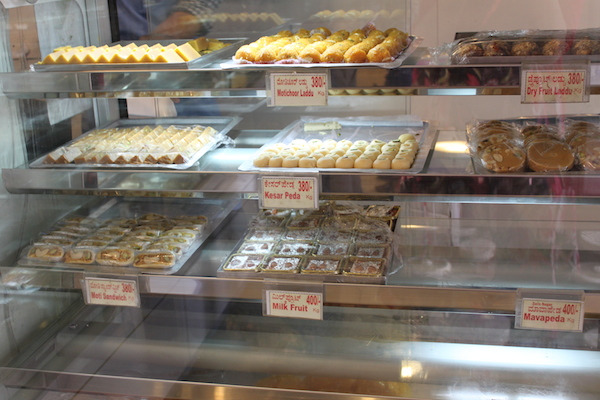 写真は、バンガロールはカーンティ・スウィーツのショーケースです。 上段と中段の左端に並んでいるのは、バンガロール名物、バターキャラメル味のとびきりすてきなお菓子、「マイソール・パック」です。 ASKSiddhi 2014 Photo Gallery