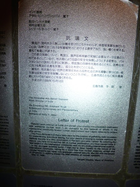 広島平和祈念資料館にて。 1998年当時の広島市長から、アタル・ビハリ・バジパイ首相に宛てた、インドの核実験に抗議する内容の声明となっています。 ASKSiddhi 2014 Photo Gallery