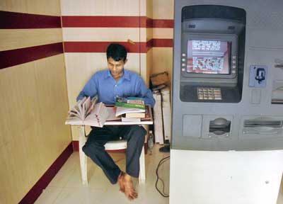 ATMを守りながら熱心に勉学に励む未来の高級官僚
