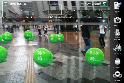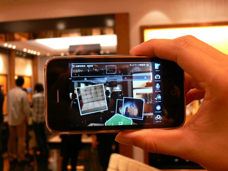 Sekai Camera is Augmented Reality (AR) free-software provided by a Japanese venture Donchidot (http://sekaicamera.com/) through AppStore, which runs on iPhone. Since it was announced in TechCrunch50 2008 (http://www.techcrunch50.com/) on 9th Sept. 2008, it has been receiving great response among iPhone users with millions of download, not only from Japan but from more than 77 countries world-wide.