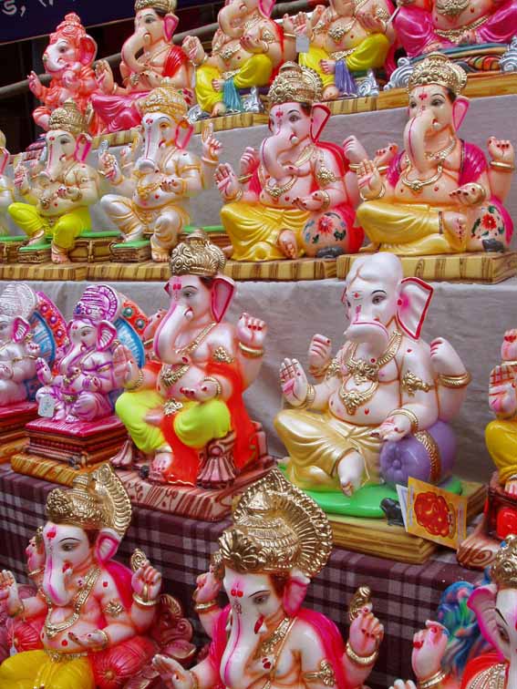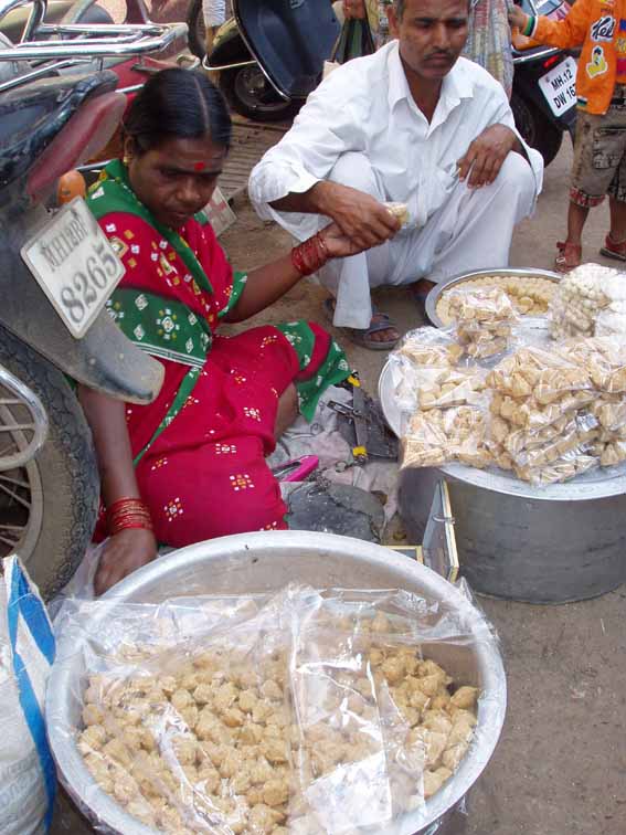 こんなバイクの脇に座り込んじゃっているのは、ガネーシャの大好物とされている、小麦粉の皮にココナッツを包んだお菓子、モダク(Modak)を売る人たち。彼らはどこから来て、どこへゆくのだろう。