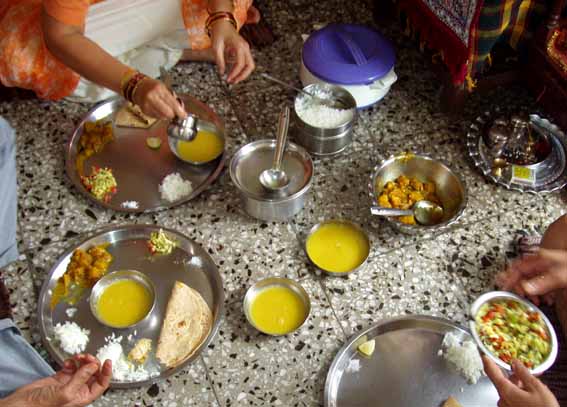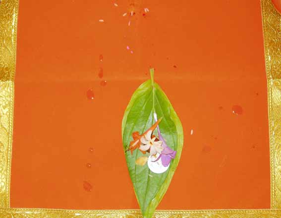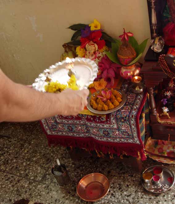ガネーシャ様も登場。次々に花や葉や果物で埋められていく~~。最後の仕上げは、やっぱりガネーシャ様大好物のモダク、マンゴーあじ。