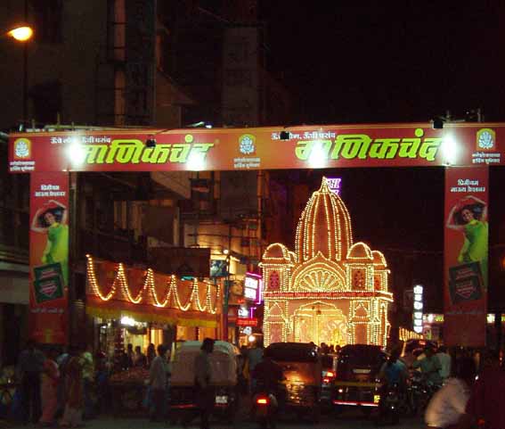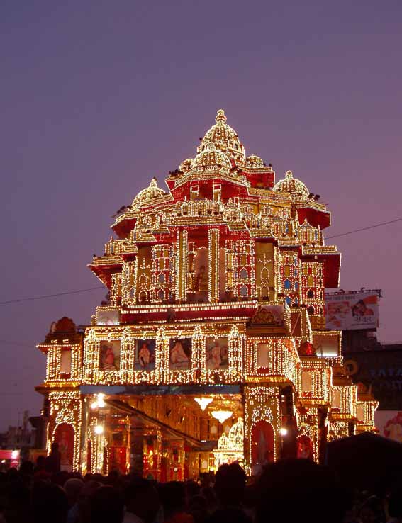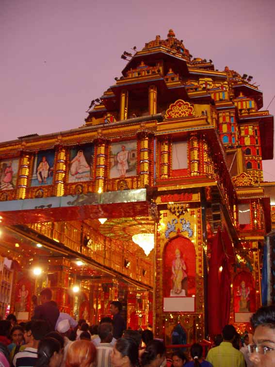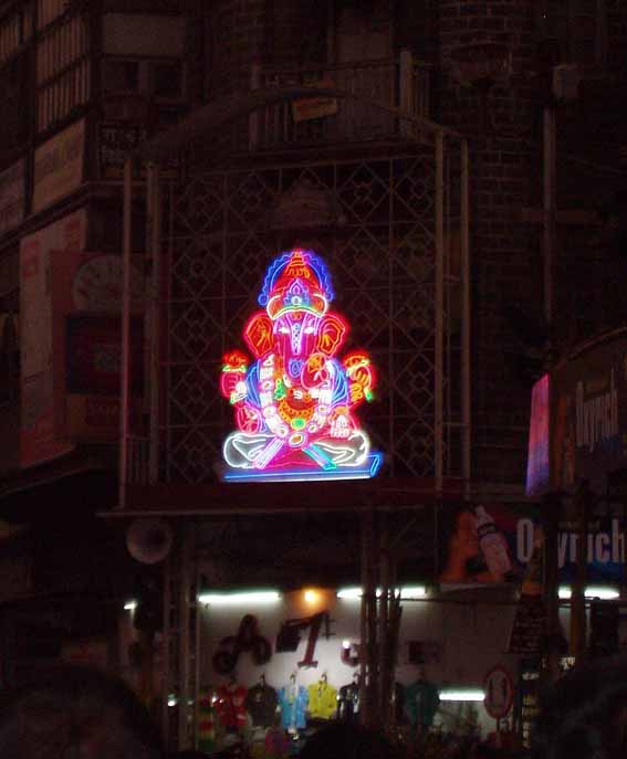 プネの大御所といえば、このダグルシェート・ガナパティでしょう。ものすごい人だかりですが、これはまだ序の口です。ガネーシャさまの撮影は、基本的に禁止されているようですが、みんなお構いなしにバシャバシャ撮っております。これらのガネーシャは、10日間デコレーションされとります。右端は緻密な電飾ガネーシャです。