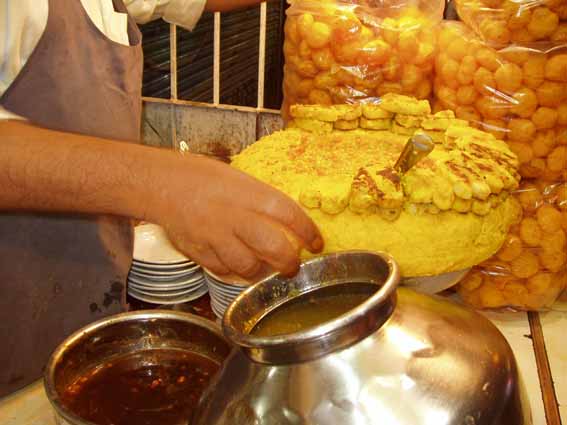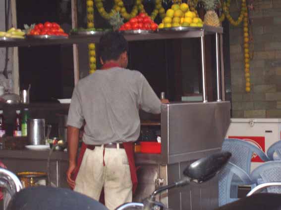 やはり食い歩き。左は屋台でパオバジを作る人の後姿、右はパニプリです。パニプリは、かなりうまいですよ。