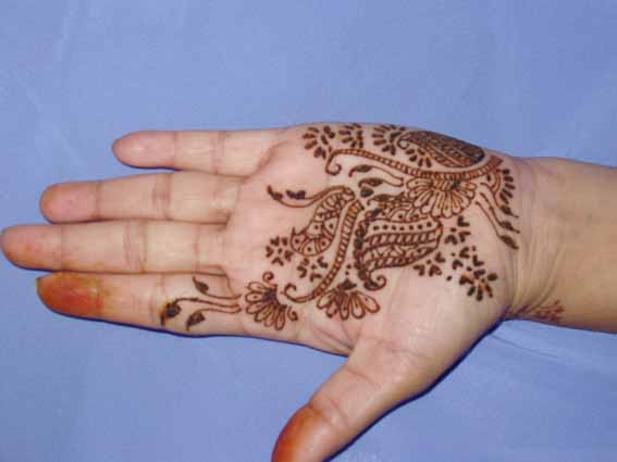 自ら描いたというメンディを見せてもらいました。青い背景は、着ていたパンジャビ・ドレスの色です。