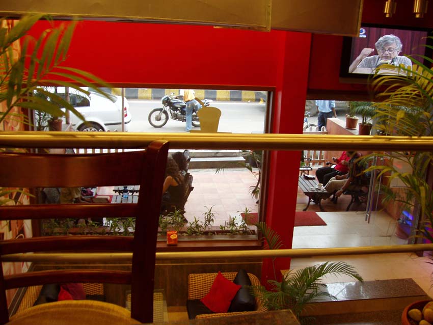 これは、カフェ好きのわたしにとって、インドにある数少ないお気に入りです。そう、カフェ・コーヒー・デイ(通称CCD)です。店内は、他の店のように、ガンガンうるさい音楽がかかっているようなこともなく、特に2階席が落ち着きます。コレガオン・パーク入り口付近、ジャーマン・ベーカリー並び。